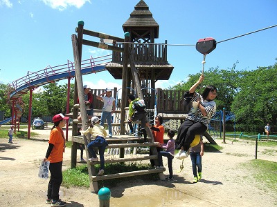 びわ湖こどもの国でアスレチックや大型遊具を使った遊びに挑戦します!もくもくの里では施設内を流れるきれいな川で魚つかみを体験し、焼いたお魚を食べよう!自然の中で思いっきり遊ぼう!