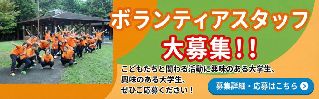 キャンプ事業や青少年施設運営に参画する「あいす・おおさか」専属の大学生のボランティアスタッフがキャンプのリーダーとして活躍しています。毎年春にこどもやキャンプが好きでこどもたちのリーダーとして活動することを望む大学1・2年生を募集し、選考採用しています。こどもたちと関わる際の知識や技術を研修や実活動の中で養い、時には同じグループの仲間として、時には野外活動の指導者として、時には保護者として、こどもたちの状況や場面に応じてサポートできるよう努めています。